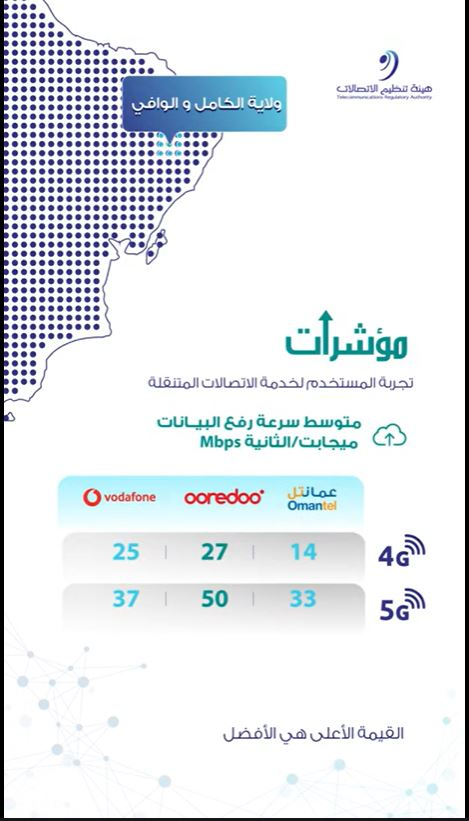 فقد بلغ متوسط سرعة تنزيل البيانات 254 ميجابت في الثانية لشبكة الجيل الخامس للشركة العمانية للاتصالات (عمانتل)، وفي شبكة الجيل الرابع بلغت 110 ميجابت. وبلغ متوسط سرعة رفع البيانات 26 ميجابت في الثانية لشبكة الجيل الخامس، و22 ميجابت لشبكة الجيل الرابع.